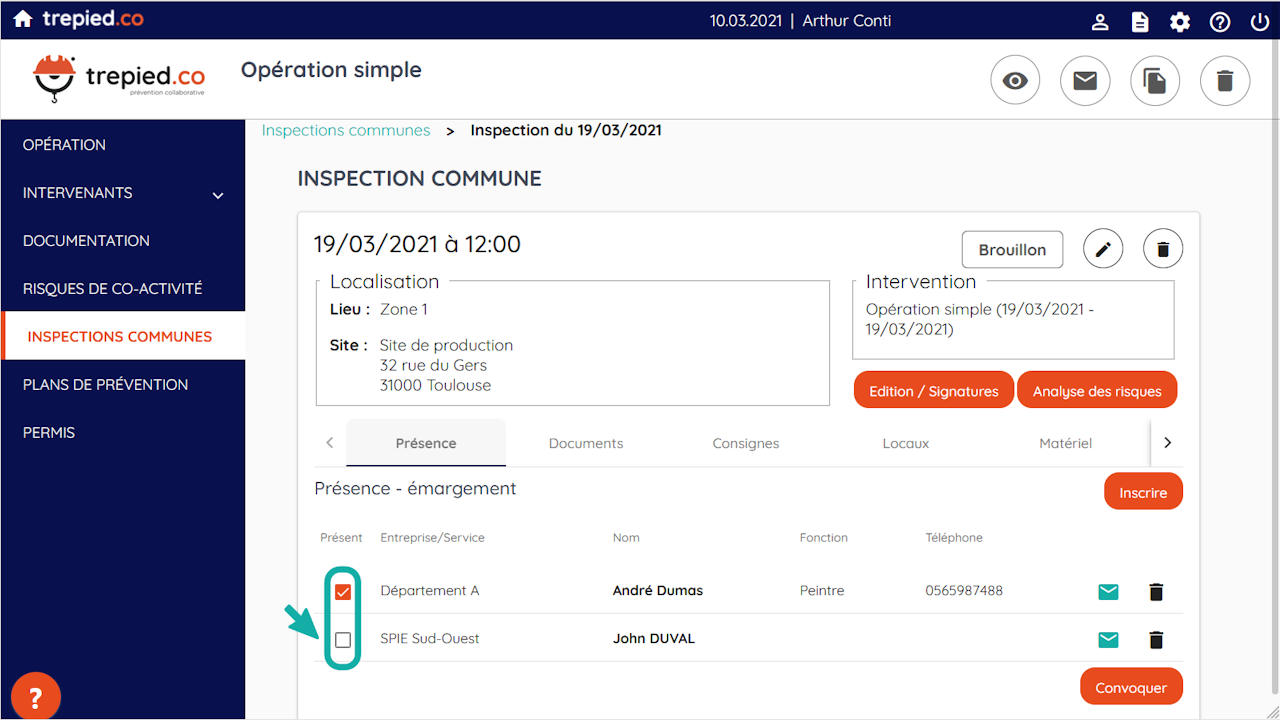 Enfin, le jour de l'inspection, la colonne "Présent" (à gauche de la liste des contacts) vous permet de cocher les personnes effectivement présentes.