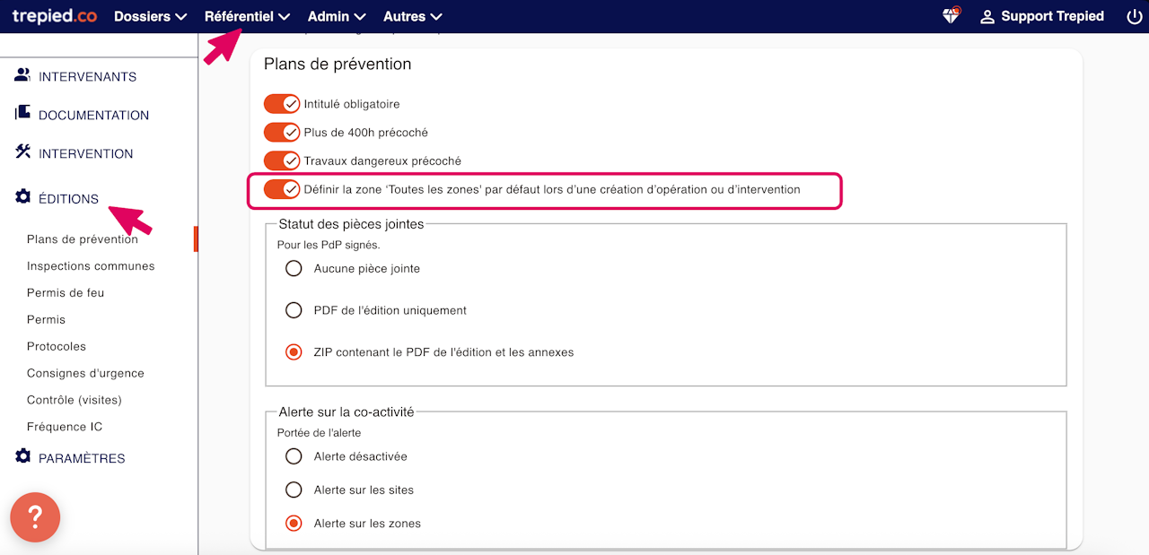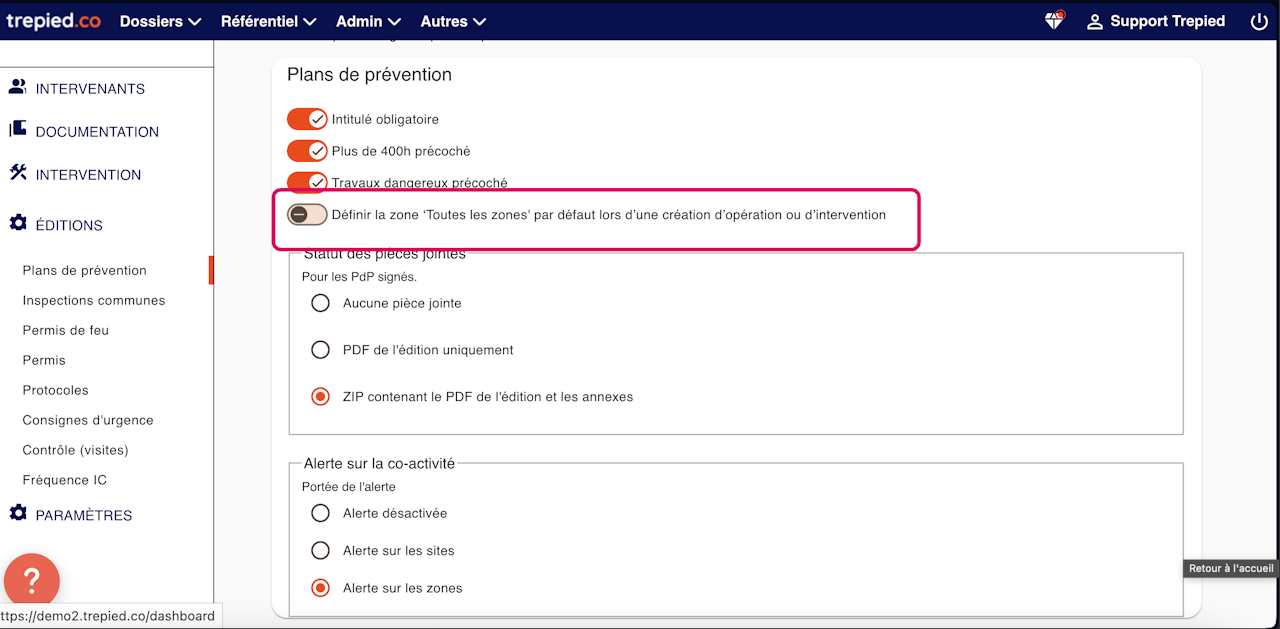 Dans Référentiel > Éditions > Plan de prévention, il est désormais possible d'activer ou de désactiver par défaut l'option "Définir la zone -Toutes les zones- par défaut lors d'une création d'opération ou d'intervention ".
