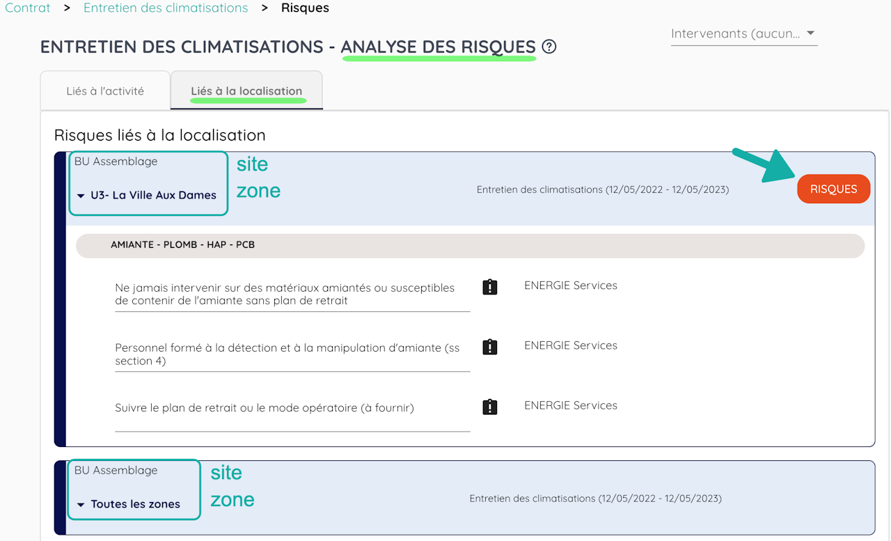 Dès lors que votre Opération ou Contrat est lié.e à un lieu (site, zone, localisation), vous avez la possibilité d'identifier les risques et mesures de prévention liés à ce lieu.