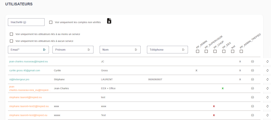La coche “X” est en gras-rouge lorsque c’est un Superviseur/Admin/CHOP non lié à un service (alerte)