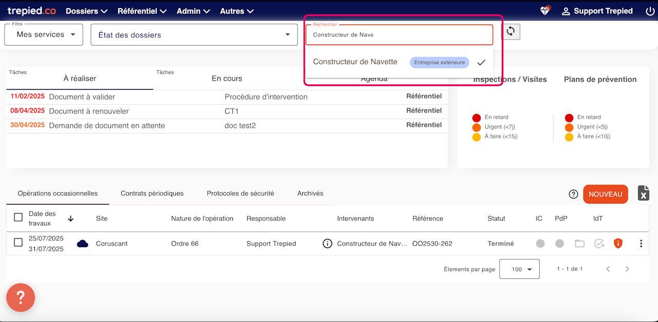 Une fois sur le tableau de bord, lorsque vous effectuez une recherche, un tag de couleur bleue apparaît à droite du nom de l'opérateur.